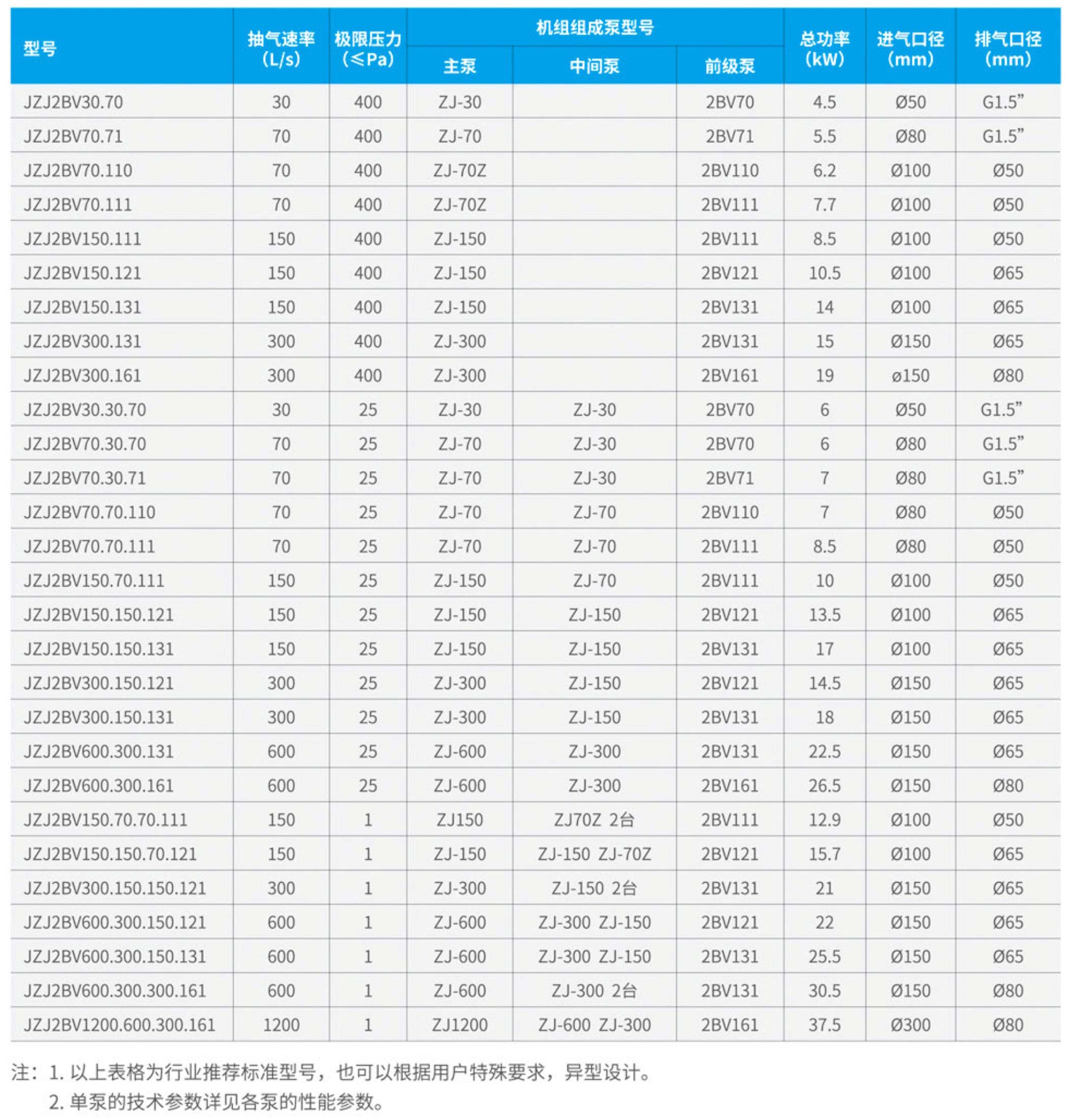 JZJ2BV型機(jī)組主要是由兩大部分組成。即泵部分(抽氣部分)和電源控制部分。JZJ2BV三級機(jī)組的泵部分是由兩臺羅茨真空泵和一臺雙級水環(huán) 式頁空泵三級串聯(lián)而成,其中雙級水環(huán)泵叫做前級泵,與被抽容器相聯(lián)的 羅茨頁空泵叫做主泵級,與前級和主泵級相聯(lián)的一級羅茨頁空泵叫做中間級,如果去掉中間級羅茨真空泵,就構(gòu)成JZJ2BV二級機(jī)組。三級機(jī)組的極限真空可比二級機(jī)組的極限真空提高—個(gè)數(shù)雖級而進(jìn)入25Pa或更高。 由千普通型羅茨真空泵不能在大氣下起動,故須在其排氣端預(yù)先抽成真 空,然后再起動,所以在羅茨真空泵出口須配備前級真空泵(簡稱前級泵)作為預(yù)抽泵。對千JZJ2BV三級機(jī)組而言,主泵級的前級泵是中間級,中間級的前級泵為雙級水環(huán)泵。對千JZJ2BV二級機(jī)組而言,主泵級的前級泵即為雙級水環(huán)泵。 各級真空泵之間抽速比(后級泵抽速與前級泵抽速相比)要符合一定的比例。考慮到在高抽速比下前級泵配用功率和抽排氣能力的不足對后級真空 泵的不利影響。一般抽速比不宜大千3,而以取抽速比為2左右為佳。 由千羅茨頁空泵具有優(yōu)良的抽氣特性(在低壓下具有大的抽速),且在羅 茨真空泵的極限頁空范圍內(nèi)使用羅茨頁空泵作為后級泵,總能比前級頁空 泵提高一個(gè)數(shù)岱級的真空度(如前級真空度為100Pa,那未使用羅茨真空 泵作后級泵,就可提高到10Pa,余類推)。由于羅茨真空泵的轉(zhuǎn)子與轉(zhuǎn)子,轉(zhuǎn)子與泵腔均無機(jī)械接觸,無須潤滑,故其功率損耗就明顯小千具有相同抽速的其它類型機(jī)械遼空泵。又由千JZJ2BV型機(jī)組配備雙級水環(huán)泵作為其前級泵,所以對抽除具有一定腐蝕性 含水蒸汽益大的工業(yè)流程特別適宜。