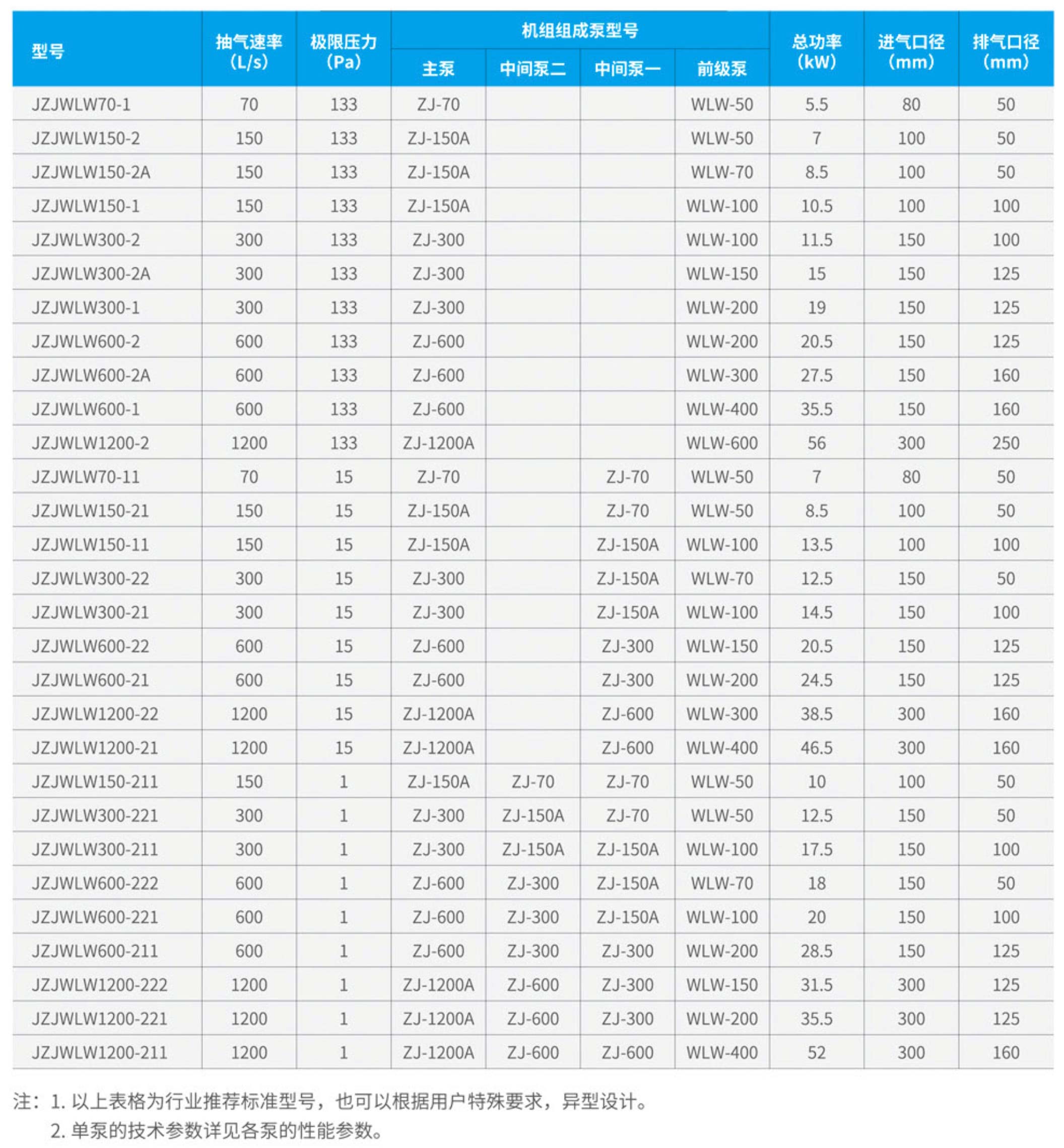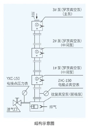 JZJW型羅茨往復(fù)式無油真空機(jī)組是由兩大部分組成,即泵部分(抽氣部分)和電源控制部分。JZJW型的四級機(jī)組的泵部分是由三臺羅茨真空泵和一臺WLW型往復(fù)式無油真空泵四級串聯(lián)而成,其中無油真空泵叫做前級泵,與被抽容器相聯(lián)的羅茨真空泵叫做主泵級,與前級泵和主泵級相聯(lián)的羅茨真空泵叫做中級泵、如果去掉中間級一臺羅茨真空泵,就構(gòu)成JZJW型三級機(jī)組;如果去掉中間級二臺羅茨真空泵,就構(gòu)成JZJW型二級機(jī)組,本型號二級機(jī)組的極限真空為133Pa,三級機(jī)組的極限真空為15Pa,四級機(jī)組的極限真空為1Pa。 由于普通型羅茨真空泵不能在大氣下起動,故須在排氣端預(yù)先抽成真空,然后再起動,所以在羅茨真空泵進(jìn)出口須配備前級真空泵(簡稱前級泵)作為預(yù)抽泵。對于JZJW四節(jié)機(jī)組而言,主泵級的前級泵為2號羅茨真空泵,2號羅茨泵的前級泵為1號羅茨真空泵,1號羅茨真空泵的前級泵為無油真空泵;對于JZJW型三級機(jī)組而言(去掉2號羅茨真空泵),主泵級的前級泵為1號羅茨真空泵,1號羅茨真空泵的前級泵為無油真空泵;對于JZJW型二級機(jī)組而言(去掉二臺中間泵),主泵級的前級真空泵為無油真空泵。 各級真空泵之間的抽速比(后級泵抽速與前級泵抽速比)要符合一定的比例。考慮到在高抽速比下前級泵配用功率和抽排氣能力的不足對后級真空泵的不利影響,一般抽速比不宜大于3,而以取抽速比為2左右為佳。 由于羅茨真空泵具有優(yōu)良的抽氣特性(在低壓下具有大的抽速),且在羅茨真空泵的極限真空范圍內(nèi)使用羅茨真空泵作為后級真空泵,總能比前級真空提高一個數(shù)量極的高真空(如前級真空度100Pa,那未使用羅茨真空泵做后級真空泵,就可提高到10Pa,余類推)。由于羅茨真空泵的轉(zhuǎn)子與轉(zhuǎn)子,轉(zhuǎn)子與泵腔均無機(jī)械接觸,無需潤滑,故其功率損耗就明顯小于具有相同抽速的其他類型機(jī)械真空泵。又由于前級真空泵采用無油潤滑的無油真空泵,對抽除遇油反應(yīng)的氣體和尾氣需回收的工業(yè)過程,特別適宜。